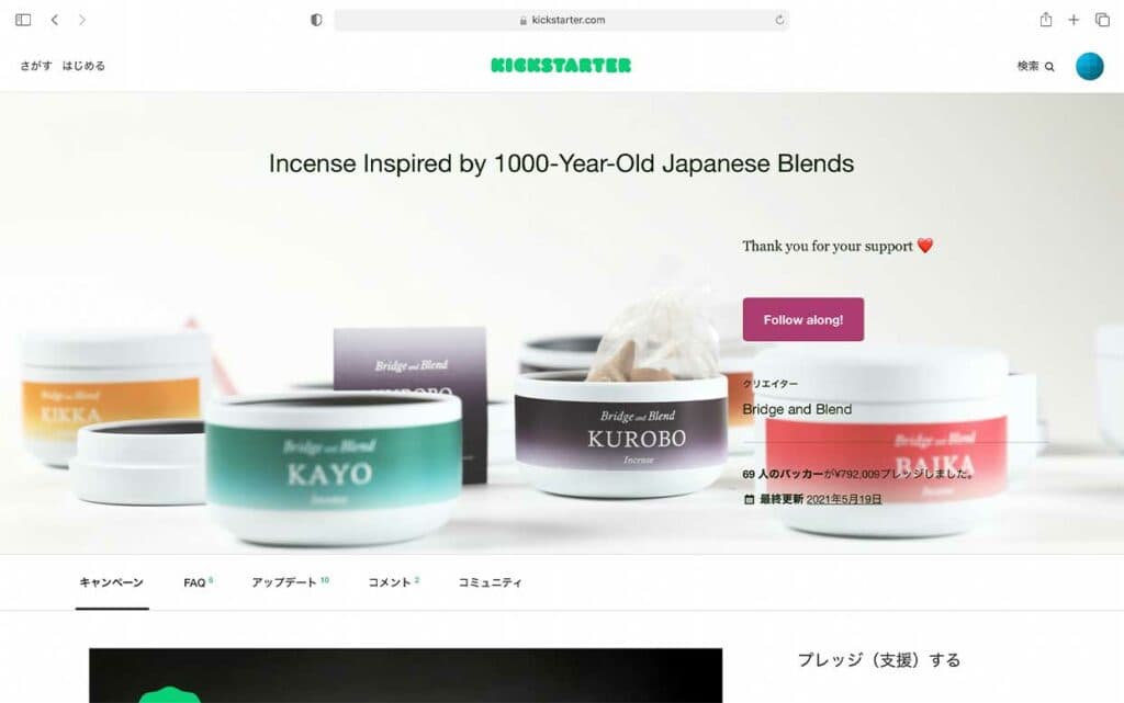 「日本の香り」を探究する中で出会った平安時代を代表するお香「六種の薫物(むくさのたきもの)」を米国の消費者に広く伝えるため、「Incense Inspired by 1000-Year-Old Japanese Blends (千年前の日本へ誘う香り)」というプロジェクトを立ち上げました。このプロジェクトでは 1900 万人が登録するクラウドファンディング「Kickstarter」を活用しました。クラウドファンディングの起用は情報拡散も目的のひとつとしており、もともとマーケティングプランには入っていました。ただし、試香できる機会も提供することが前提で。まさか、コロナ渦で当初予定していた試香しながらプレゼンする機会を失い、アメリカへの EMS が送れなくなりサンプルデリバリーも困難になり、嗅覚を使わずに、視覚と聴覚だけで香りを表現、そして共感してもらうことになるとは。