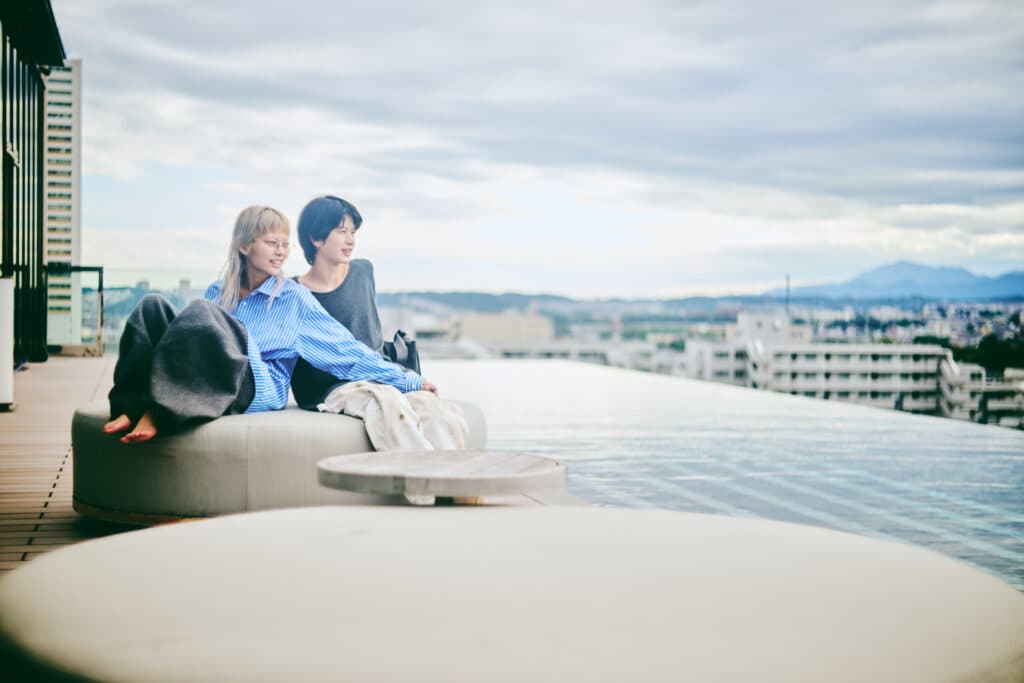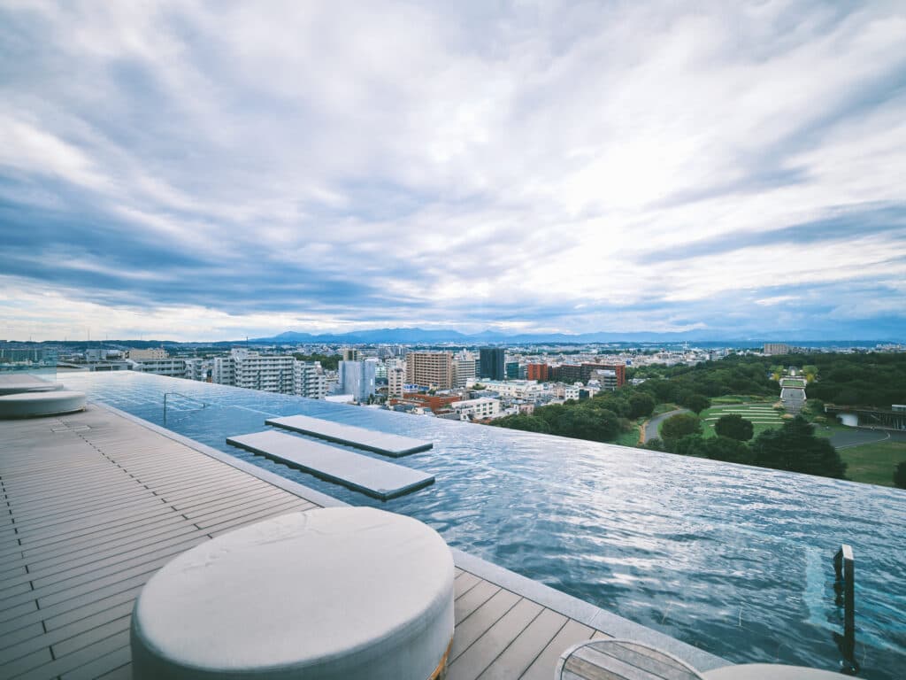 チェックイン後、早速訪れたのは11階。そこに広がるのは、まるで空と一体化したような「インフィニティプール」です。青空と目の前に広がる昭和記念公園の自然、そして天気が良ければ富士山が見えることも。そんな景色に思わず「あれ、ここ東京だっけ?」と声が漏れ出てしまいます。