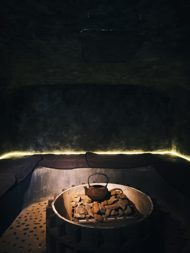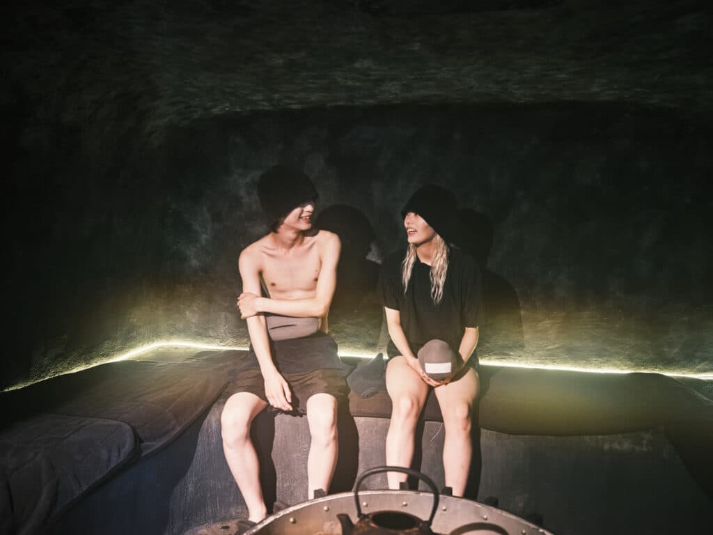 早速入ってみると、中はまるで洞窟のよう。木のサウナとの大きな違いは、その「過ごしやすさ」。土に蓄熱された熱を浴びるため、「熱っ!」という痛々しさがなく呼吸がしやすいのもポイントです。からだにやさしい温まり方で、わいわい会話を楽しみながら過ごすことができます。