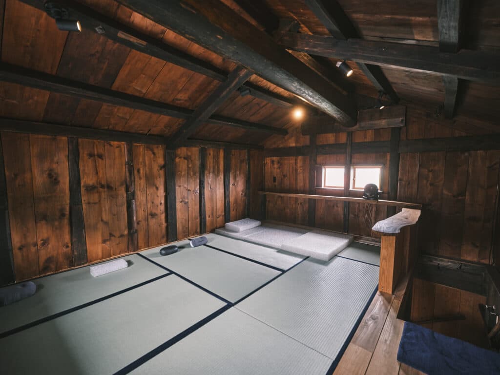 部屋に入ると、気持ちのいい畳が広がります。築150年の古民家にあった柱や畳を最大限生かした、どこか懐かしい雰囲気に心がほっと落ち着く空間。