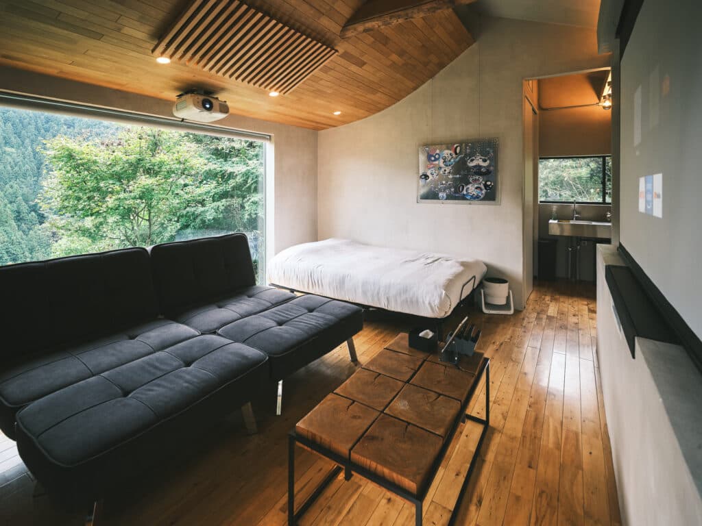 客室には100型4Kシアターがあり、映画と自然の融合を楽しめるこの施設は、まさに“泊まれる映画館”。1日1組限定のため、人工のものが何一つ見えないこの景色を独り占めできちゃいます。