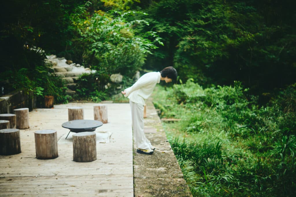 「トマトかわいい~!」「アメンボがいる!」と、庭での発見を楽しむ2人。宿泊できるのは1日最大4組のため、この庭で夜に行われる焚き火に参加したり、ただ座って自然の音を聞いたり、静かな時間を過ごすことができます。