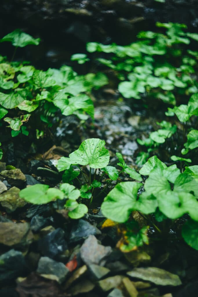 「Satologue」の庭は、かつて養魚場として使われていた場所。ここにはシェフ自らがオクラやトマト、ナスなど、さまざまな無農薬野菜を育てる自家農園と、さまざまな植物や生物に出合えるビオトープ、きれいな水が必要とされるわさび田があります。