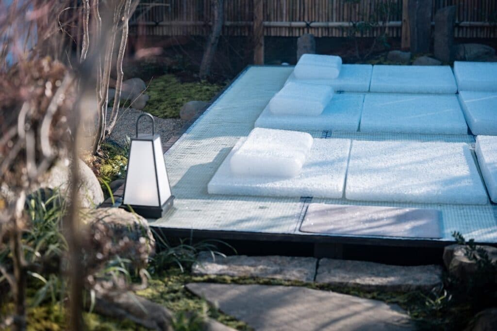 その他にも、京都の川床をイメージした屋外の畳スペースや、床暖のようにポカポカとしたサウナの蔵の2階にある屋内スペース、古民家といえばの縁側スペースなどの休憩スペースが。日本の四季を感じたり、会話を楽しみながらゆったりとリラックスできます。
