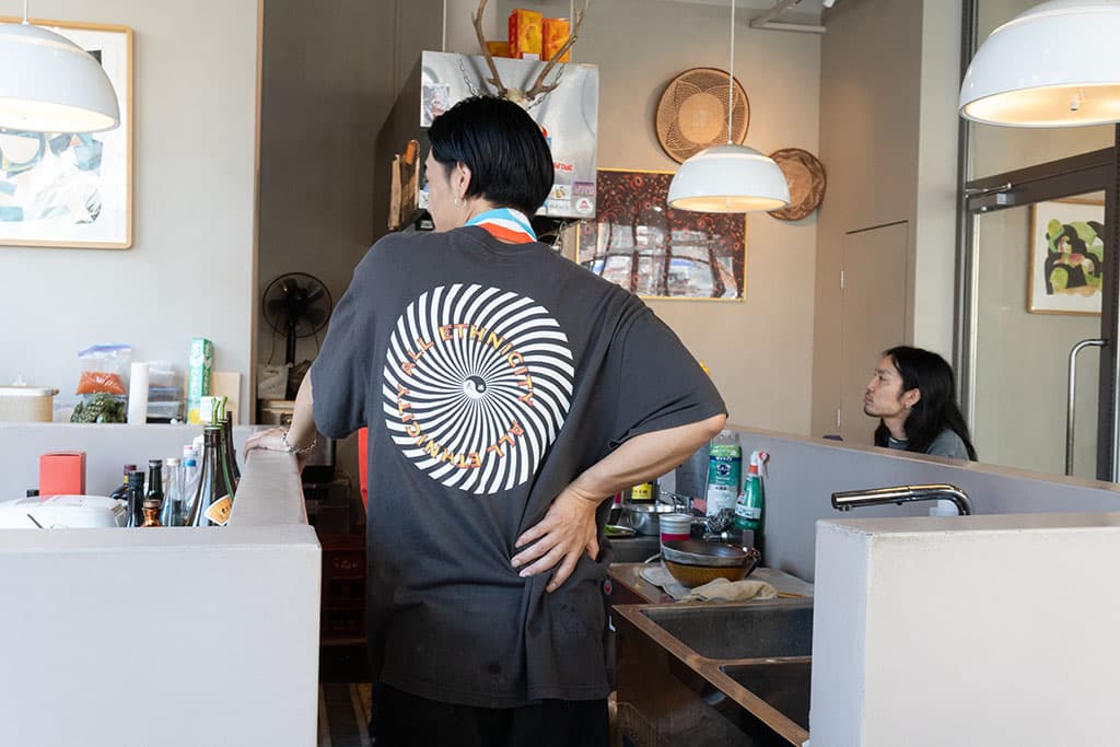「民族中華」オリジナルTシャツのプリントを担当しているというその客は「ユウスケとは東京渋谷で出会ったんですよ。見たことのない最高の中華を作ってくれるから、2人にしょっちゅう会いに来るんですけどね」と笑う。いつのまにか、子どもの頃の金縛り体験という他愛ない話題でゲラゲラと笑う盛り上がりに変わっている。