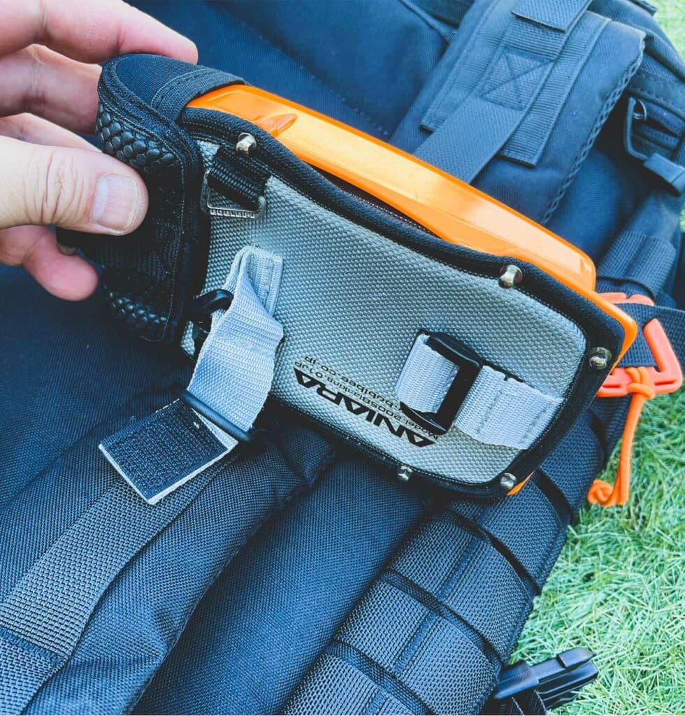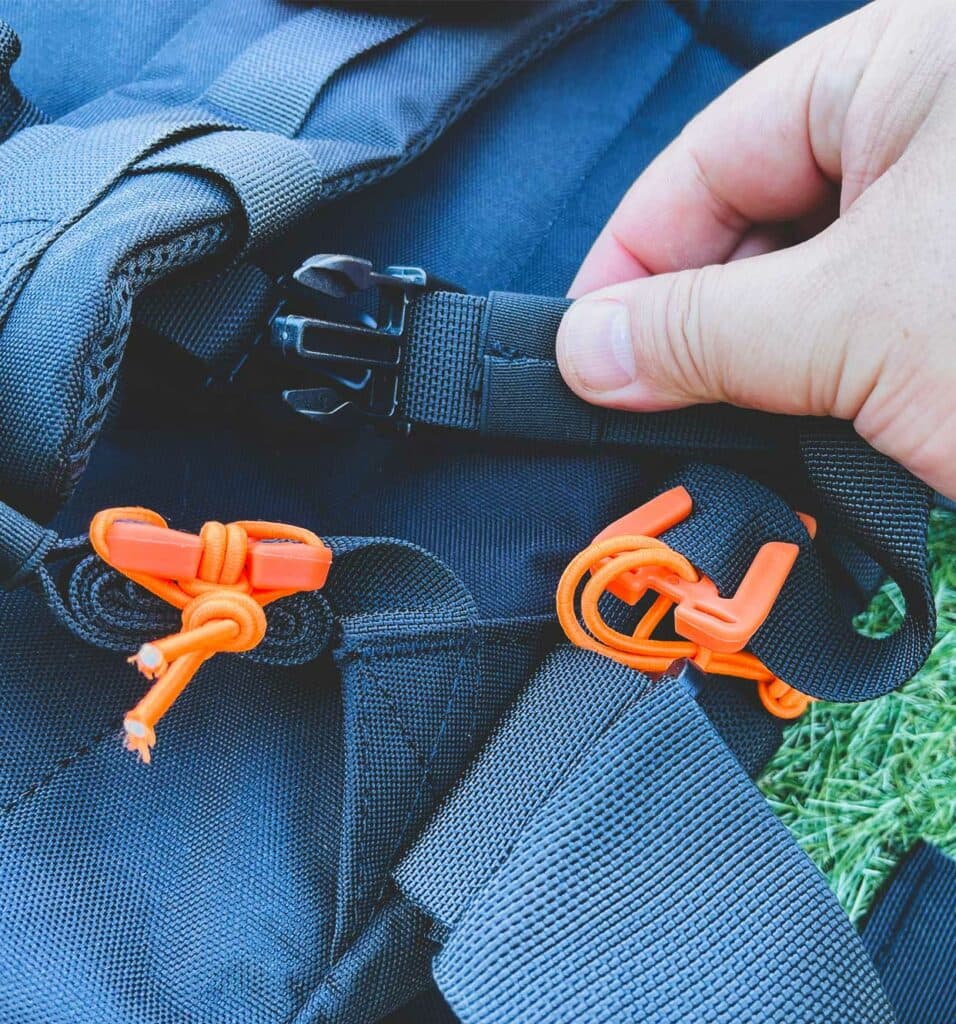 あまったベルトは、ポーチと同色のウェブドミネーターで丸めて固定。1インチ幅のベルクロテープでもいいのですが、これだと周囲にひっかかりにくくなるし、ストラップ類が動かなくなります。ベストサイズをキメたあとに、いつでも同じ背負い心地となるので、他のバックパックを使っている方にもオススメです。