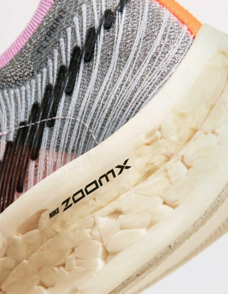 そのほか、細かな部分まで徹底してリサイクル素材を活用している。たとえば、アウトソールには、シューズの製造工程で出たスクラップや端材、使用済みのフットウエアから作られたナイキ グラインド ラバーを利用。織ネーム、シューレースは100%再生ポリエステルを使用。リサイクルしたズーム X フォームの小片を形成し直し、布状の素材にしたナイキ ズーム X ソックライナーを、インソールとして採用している。