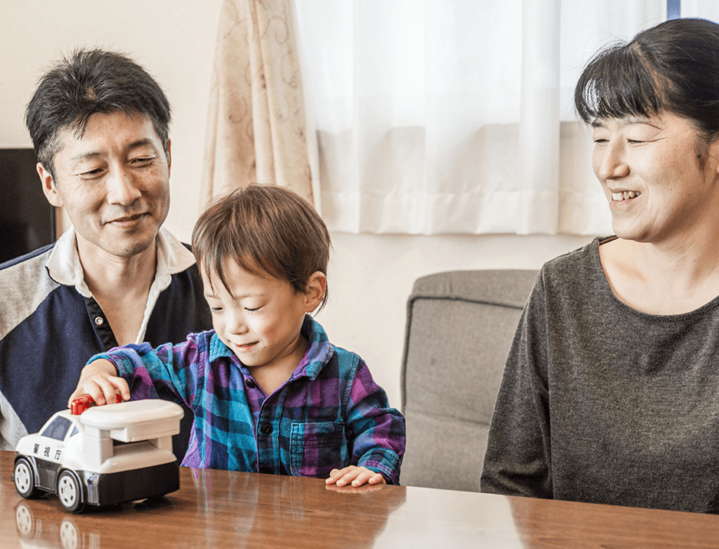 「同年代の子と比べて、すごくよく食べるんです。好き嫌いも全くなくて、今は揚げ物や納豆に夢中ですね」。そう話す関野さんご夫妻の影に、はじめのうちは恥ずかしそうに隠れていた竜佑ちゃん。
