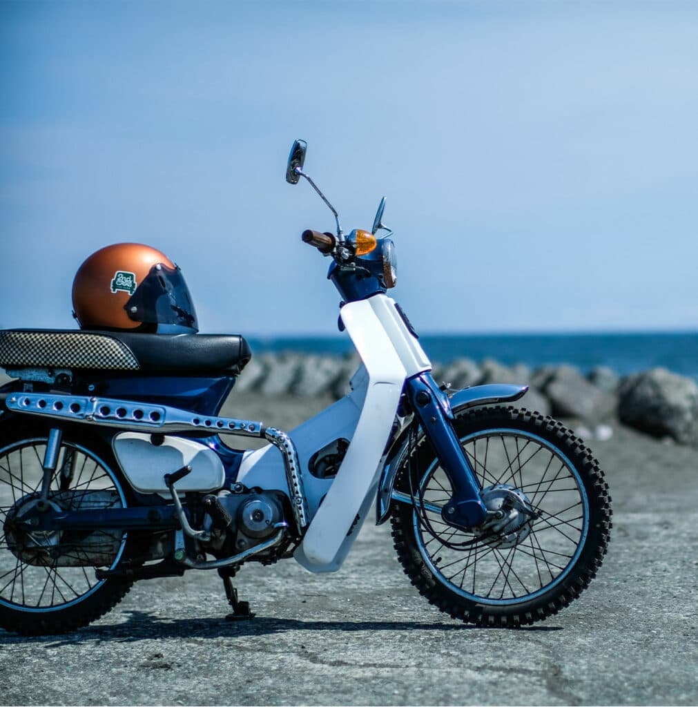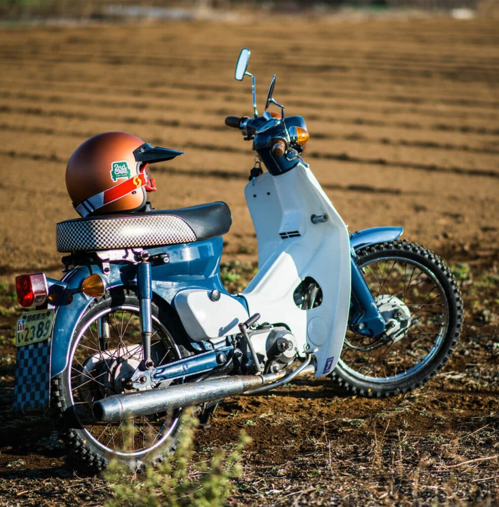 こちらは私が所有するスーパーカブ。ブロックタイヤに履き替えてちょっとしたオフロード走行にも対応できるようにしてある。アジア製のカスタムパーツを駆使すればそれほどお金をかけずに自分好みのスタイルに仕上げられる。