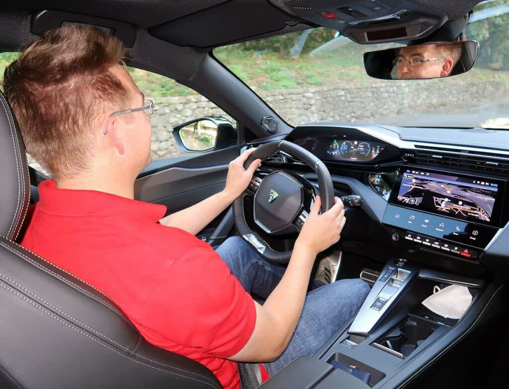 In "hybrid" mode, the system decides depending on the situation whether the electric motor, the petrol engine or both drives are used. During everyday driving, the Peugeot 308 is incredibly quiet and suppresses most surface bumps. As long as the battery delivers energy, the Peugeot 308 Hybrid 225 reaches an average fuel consumption of about 3.0 l/100 km during our drive through cities, on country roads and on the motorway.