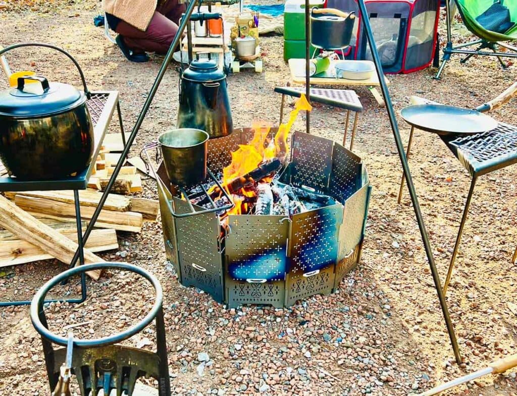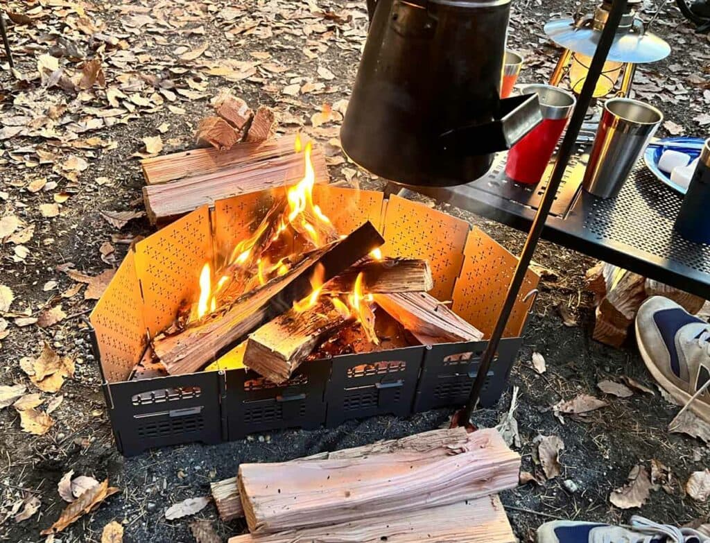 焚火グリルや五徳なんかをうまく使えば料理もできるし、料理の際、ウチの場合はオーヴィルのラウンジテーブルというスチールテーブルに乗せて使ってて、そうする事で目の前で料理作りが出来るので、ここでもこの形と大きさが故のメリットを感じるね。