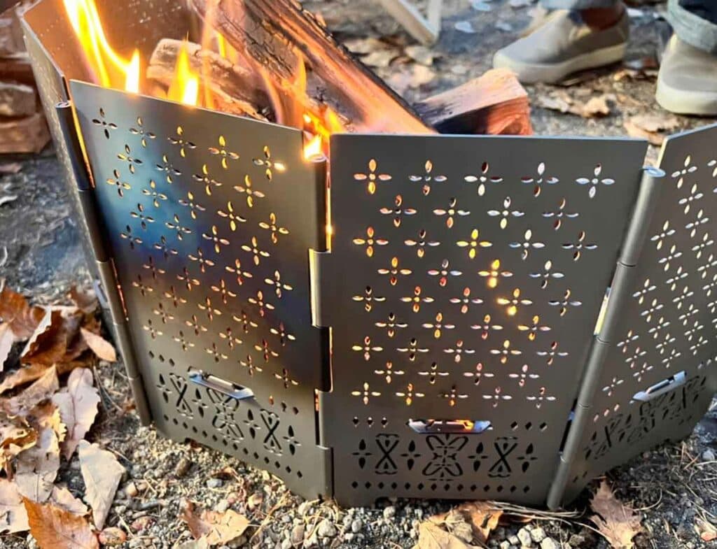 それが、サンゾー工務店というガレージブランドが作った「RODAN」という焚火台。暖炉をモチーフにした組み立て式焚き火台で、基本セットの「STANDARD」(ソロ用でコンパクトな六角形の焚き火台が組める)に、別売りの拡張セット「HANGETSUセット」を買い足すと完成する、半円形の「HANGETSU」というモデル。持ち運びを考えた専用ケースも含めパーフェクト!