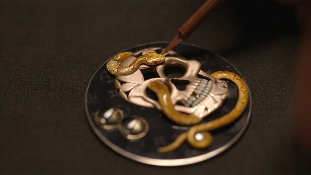 エナメルペインティングは、スイス時計界の第一人者であるアニタ·ポルシェが担当。ぬらっとした光沢感で、ヘビのリアリティを高めている。