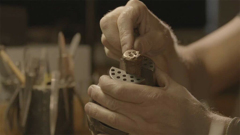 ケースのデザインは携帯用の太鼓をイメージした、優美なフォルムが特徴。美しい彫金仕上げを施した2時位置のプッシュボタンを押すと、からくり機構が動き出す。