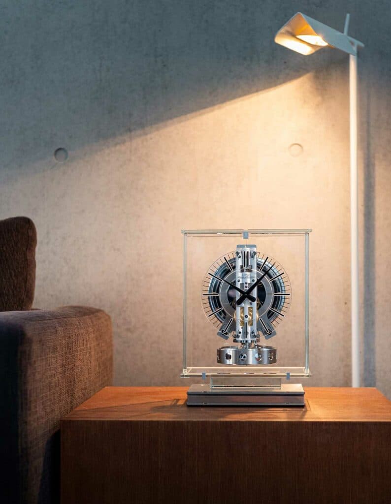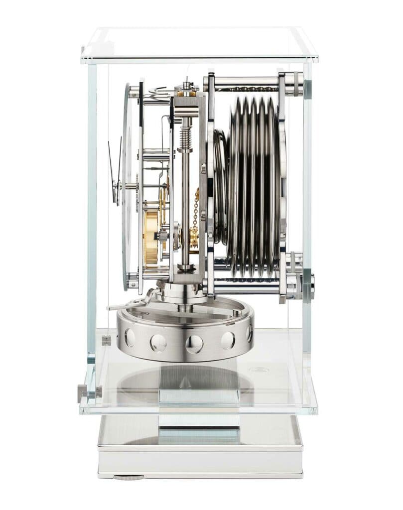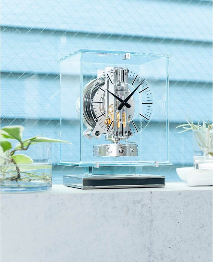 そんなジャガー・ルクルトが1928年から製作し続けているのが、置時計「アトモス」。エンジニアのジャン・レオン・ルターによって発明されたこの置時計は、温度変化によって収縮するガスをカプセルに密封し、カプセルの伸び縮みによって動力ゼンマイを巻き上げる機構。1度の温度変化だけでも2日間分のゼンマイを巻き上げ、動き続けることから、”半永久機関“とされている。