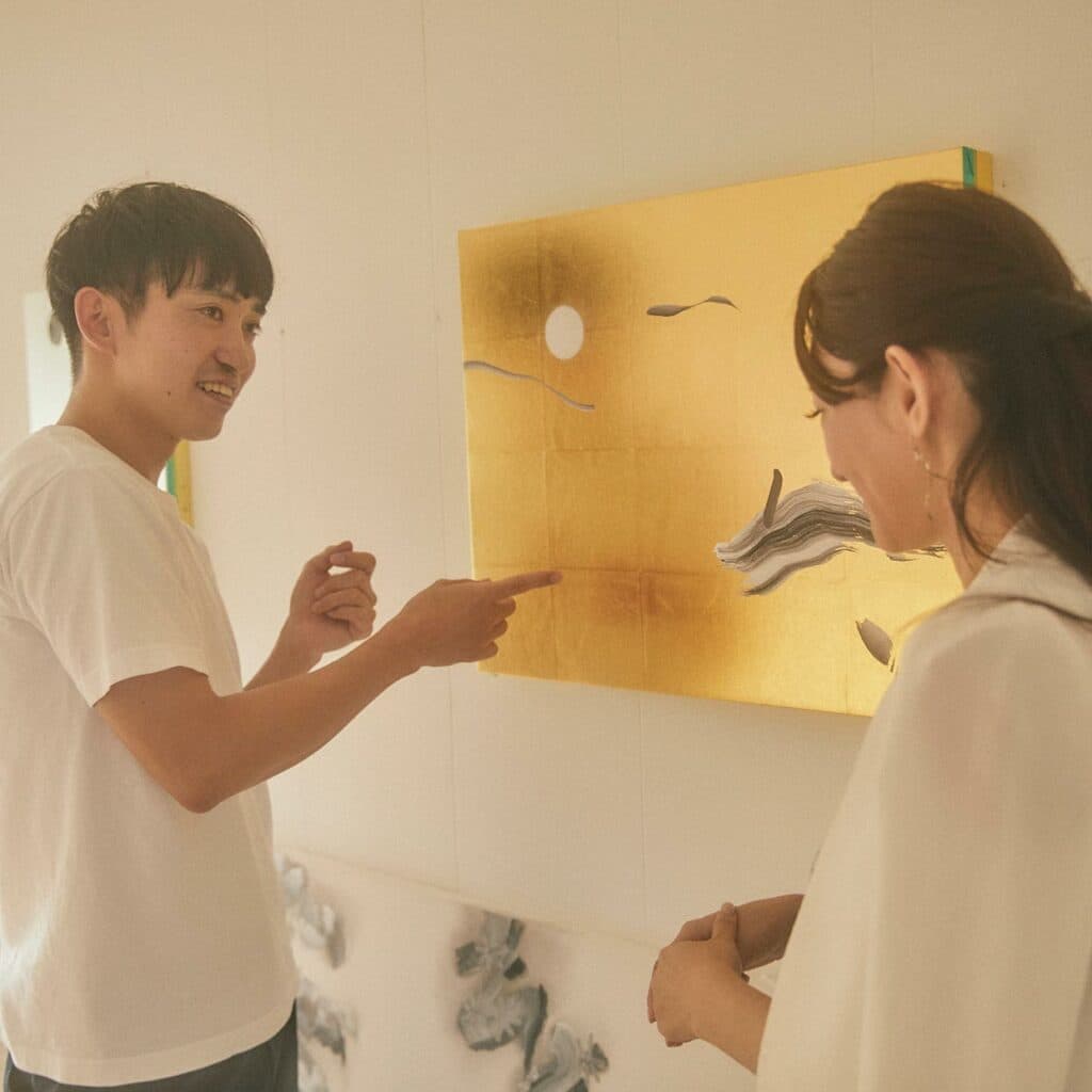 日本の絵画の文脈をふまえつつ、現代の絵画の文脈も取り入れた作品に挑戦しながら、本来あるべき日本の絵画を観たくて描いている、と語る品川さん。歴史を紐解きながら日本画の新しい価値づくりに挑戦する姿勢に、岩崎さんは魅力を感じ、2018年の個展で作品を購入した。