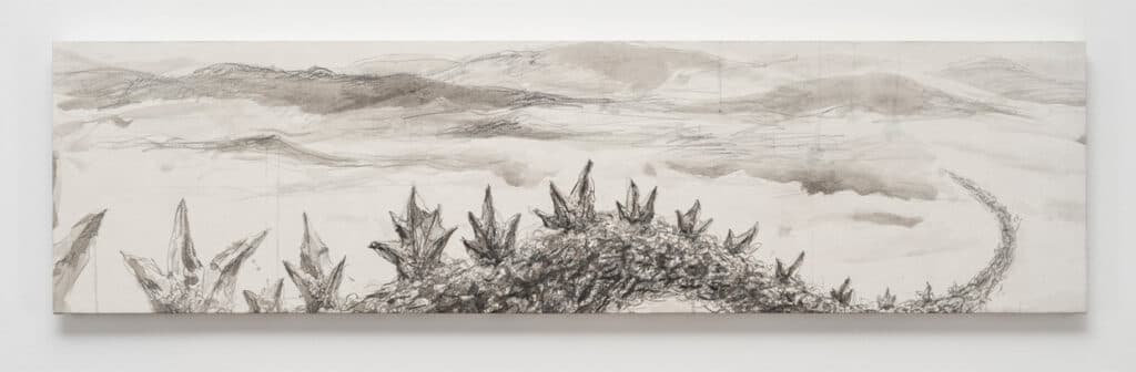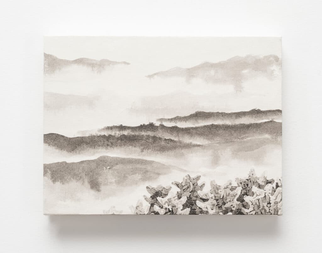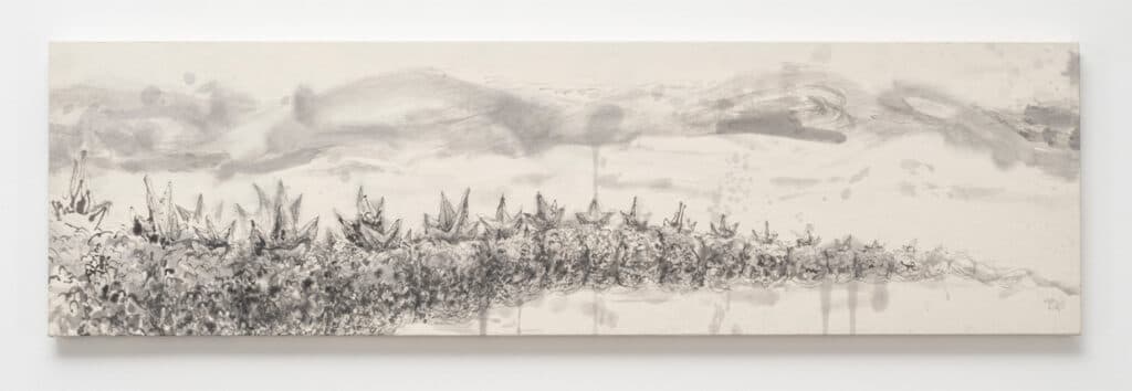 当時取り組んでいた抽象画では何かが違うと、フィールドワークで目にした風景をもとに、豊島へと何かが入ってきているような作品を描いた。このとき、もともと好きだったという鉛筆のデッサンと墨を用いたことで、現在も続く墨絵のシリーズ、そして山水画や円相のシリーズへと繋がっていく。