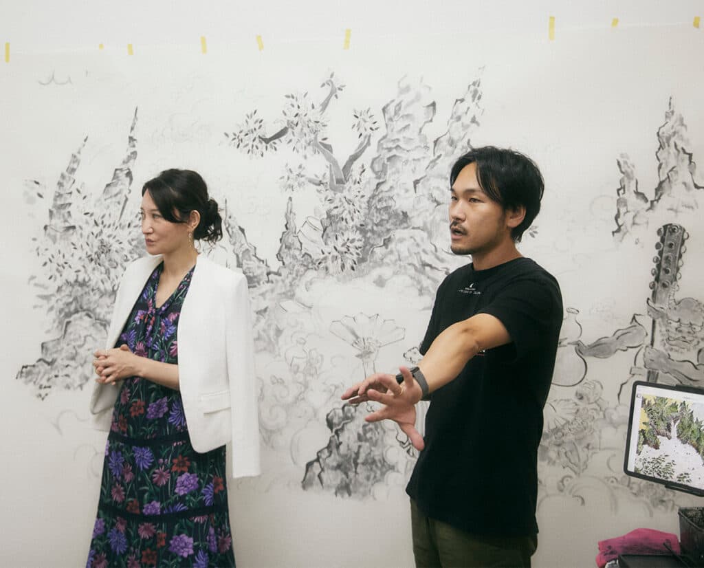 取材に伺った日は、完成すれば縦横数メートルにもなるコミッションワークに取り組んでいた西垣さん。依頼主との対話や現地でのリサーチ取材などを経て、ラフイメージ、下絵、そして実寸大で描いていくという。