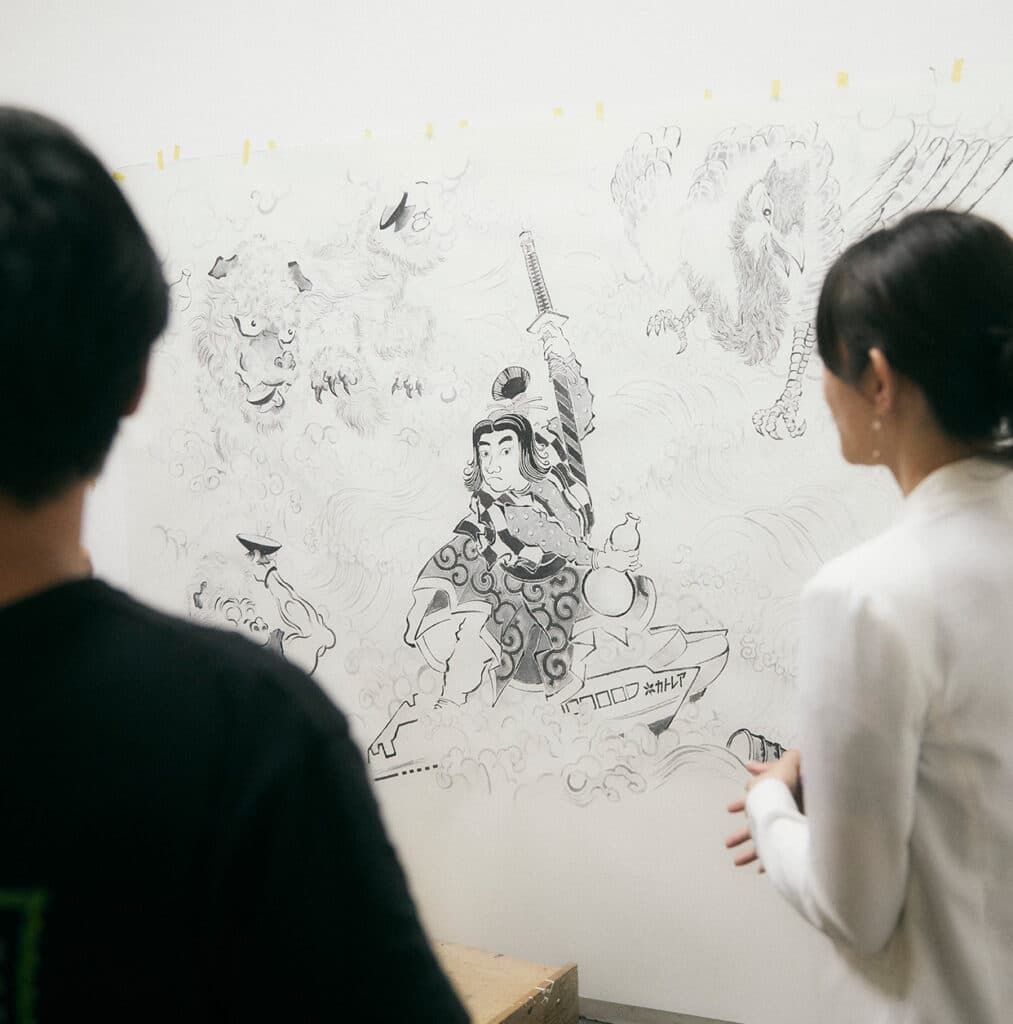西垣さん:作品は「こう描かなけば」と決めすぎず、世の中で起きていることをその都度入れるなど、ライブ感をもって描くことを大切にしています。これは、岡山に本社を置く両備ホールディングス株式会社様からの依頼で、桃太郎と鬼をモチーフに、今の世界情勢や社会の分断などから、「自分と他者」や「攻撃ではなく対話を」といったイメージで構想しています。