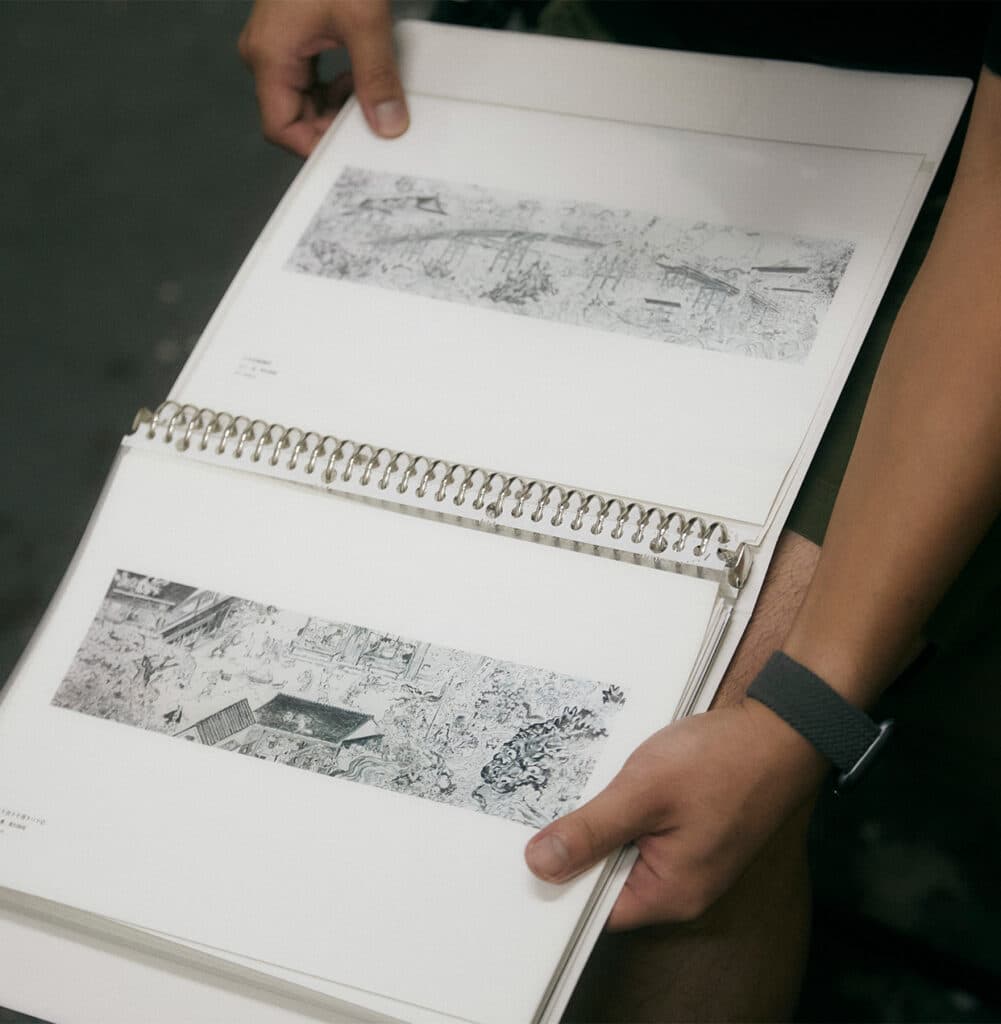 岩崎さん:なるほど。こうやって少しずつ、墨や鉛筆で描いていたんですね。それにしてもこの「アトリエ・ハイデンバン」は天井が高いですね。そもそも立ち上げたきっかけを教えていただけますか。