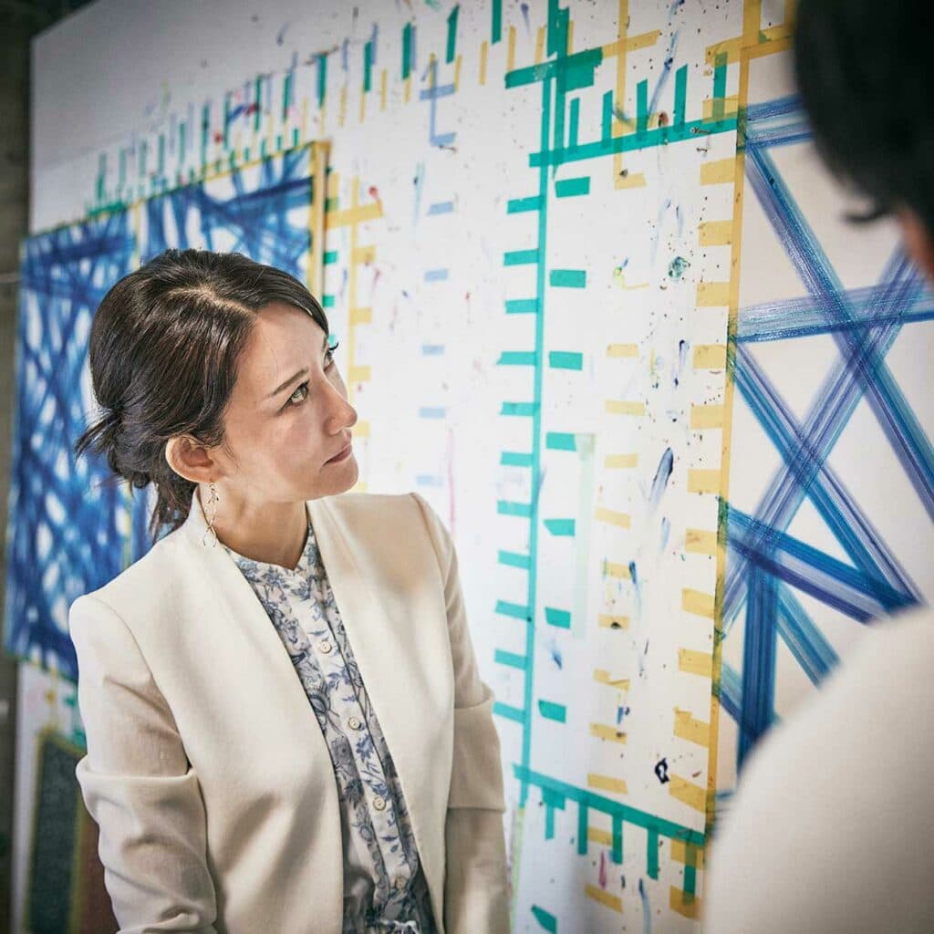 自らもアートコレクターでアートビジネスの起業家でもある岩崎かおりさん。今回訪ねたのは「大学院の修了作品展で、作品の制作意図を伺って、面白い! と買わせていただいたのがご縁」という三浦光雅(みうら・こうが)さんのアトリエです。色の線が何層にも重なる絵画作品ですが、色選びやその組み合わせ、どこに何本の線を引くのか、といったあらゆる構成要素に三浦さんの意思は介在していません。では、どうやって描くのか。そもそも、絵を描く、とは。興味深い対話となりました。