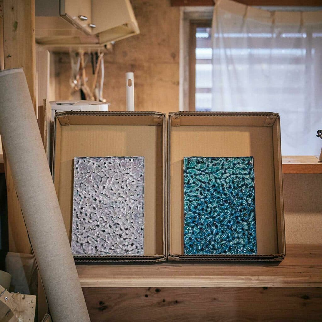 今後は平面で描いている作品を三次元化したり、彫刻的なアプローチに取り組んでみたい、と話す三浦さん。取材の合間、試作中で、と見せてくれたのは、波打つような絵具の造形が何とも興味深い作品。2枚のパネルを合わせた間に絵具を入れて引きはがす転写技法「デカルコマニー(※1)」から着想し、絵具のついた面を下にして乾燥させたという。