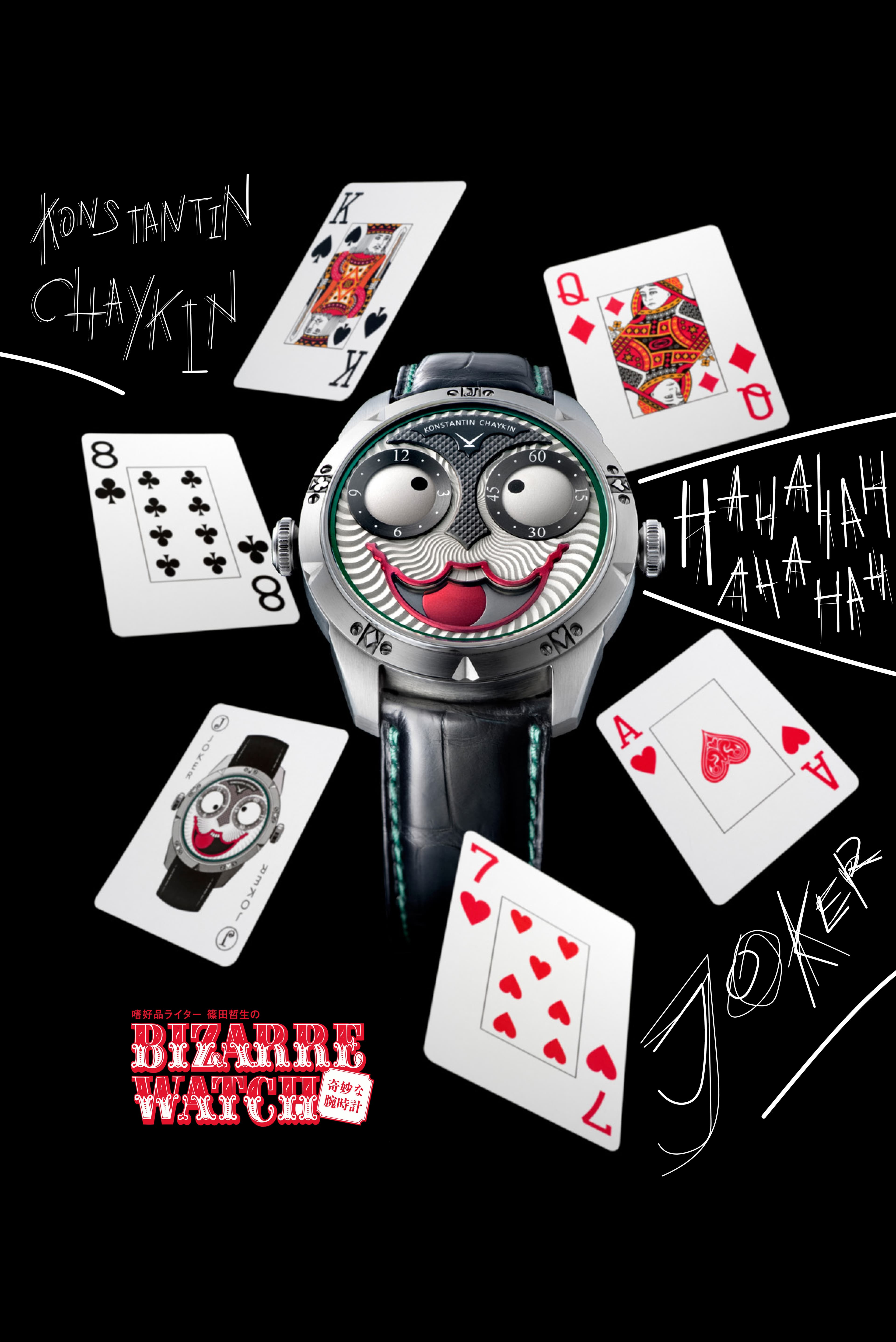 彼が作る時計は、とにかく独創性にあふれている。代表作「ジョーカー」は、時間と分を2枚のディスクを使って表現する。それ自体は珍しくはないが、ディスクをドーム型にして、そこに黒いドットを入れると、不思議なことに“目”に見えてくる。さらに6時位置には月の満ち欠けを示すムーンフェイズ表示が入るのだが、月と縁取りを赤くすると、こちらは“口と舌”に見えてくる。時分表示+ムーンフェイズというシンプルな機構を、感情を持った不思議な時計にしているのだ。
