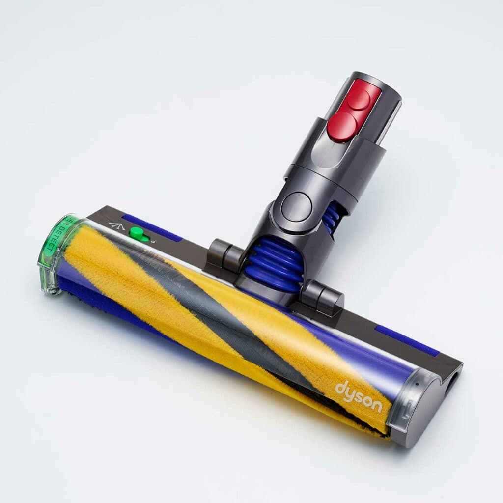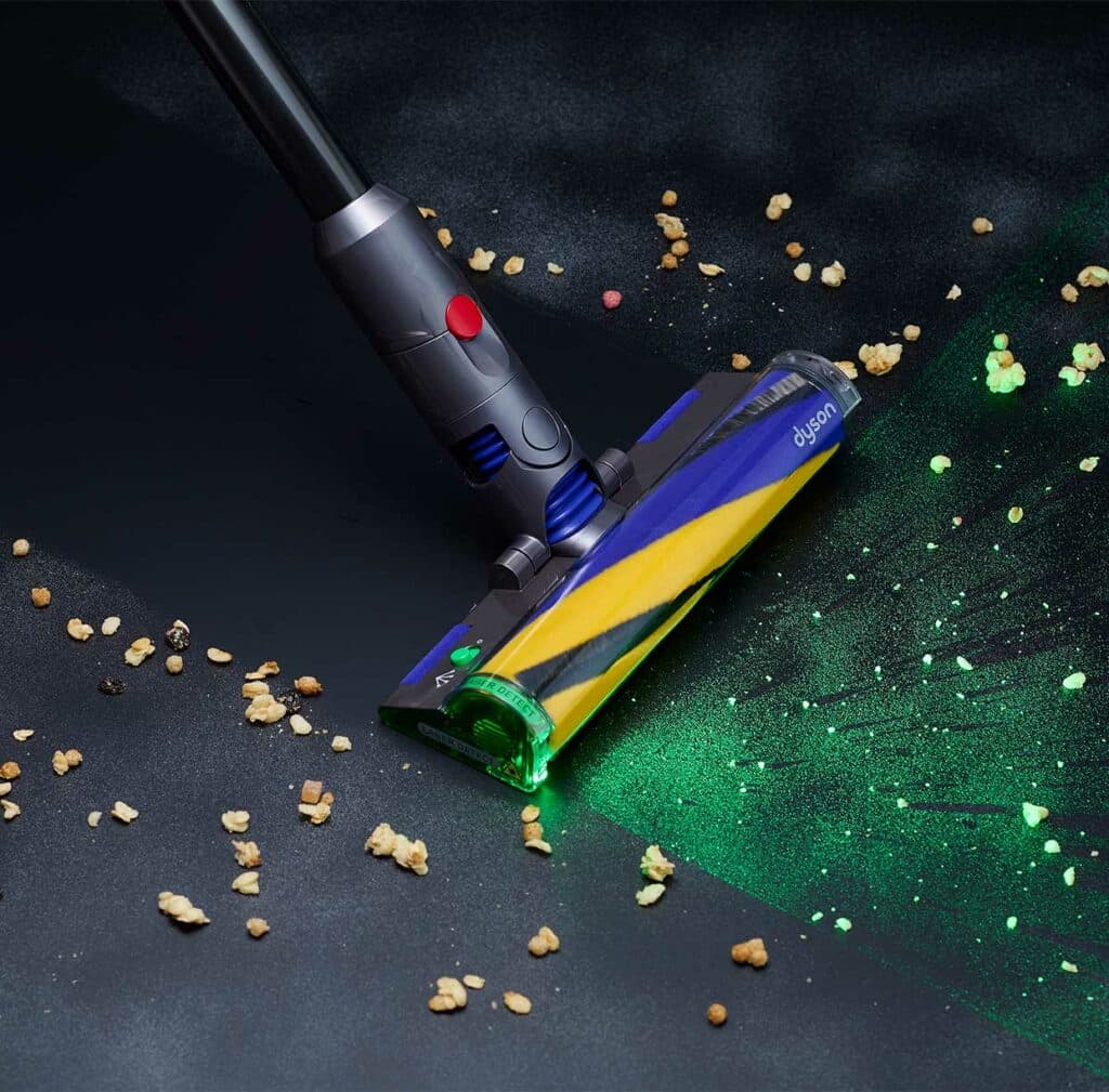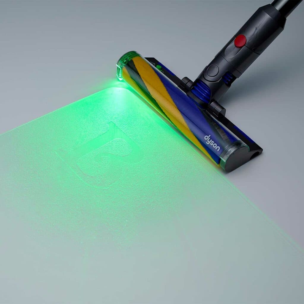 ウェイアン イエローとブルーの配色は、創業者兼チーフエンジニア・ジェームズ ダイソンが決定しました。ヘッドから出るグリーンのレーザー光に対して、見やすい色というのは意識されたと思います。ヘッド部分にはレーザーのスイッチボタンも、通常ダイソンではボタン部分は赤が使われることが多いですが、あえてレーザーの光と同じグリーンを採用しています。