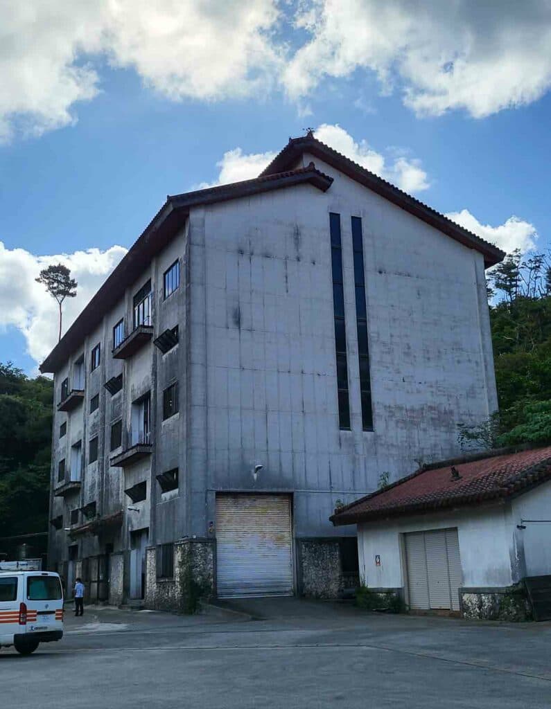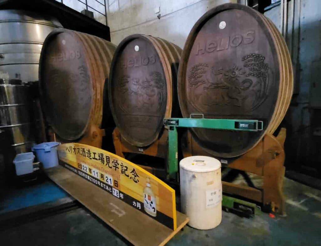 名護市許田(きょだ)にある酒造会社で、泡盛古酒「くら」などで全国的にも知られるヘリオス酒造。許田はもともと名水の地として有名で、やんばるの豊かな緑に囲まれた土地である。敷地内には一の蔵、ニの蔵などの複数の古酒蔵が建っており、「百年後の未来も太平の世がつづくように」との願いを込めて造ったオーバルカスクの百年古酒樽や、約2600樽、500万本分の「くら」の原種が眠っており、その古酒蔵内を見学できる。