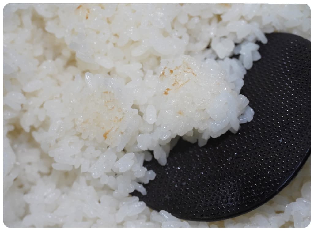 粘りが強いのか、ごはん粒同士が少しくっついてしまっている印象。特にうっすらとおこげになっている部分はダマのようになった。冷めてもごはんの香りがよく、塩むすびでも楽しめる。